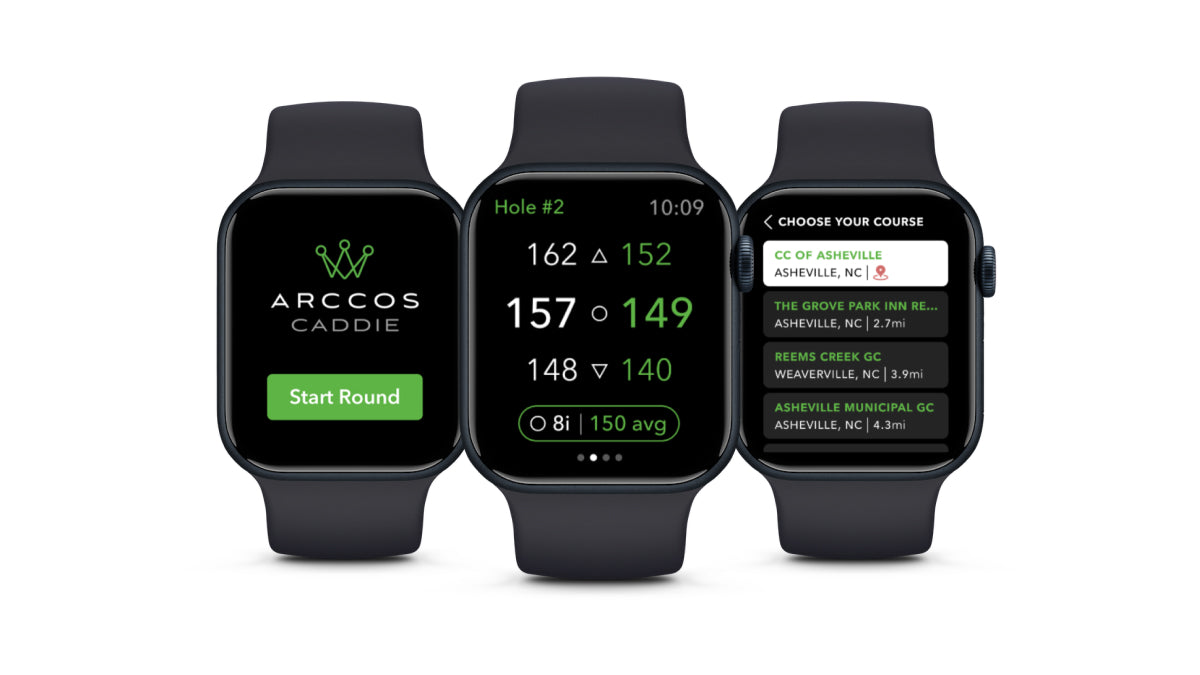 Arccos members using an Apple watch can see the A.I. Rangefinder distances (traditionally in the mobile app) now available on their Apple Watch. Just like in the phone app, players can see the front, middle and back distances, the white numbers are GPS yardages and the green numbers are yardages adjusted in real-time for slope, weather and altitude.