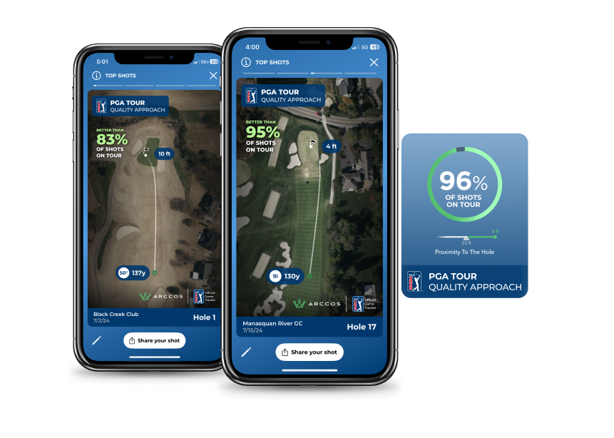 Arccos is excited to launch our new Top Shots and Tour Quality Shots to highlight the best shots in your given round. Top Shots celebrates some of your best moments from each round. Exceptional approach shots are tagged PGA TOUR Quality (TQS) when your proximity to the hole is better than PGA TOUR average. Please, set the hole location and/or confirm your first putt distance for best results.