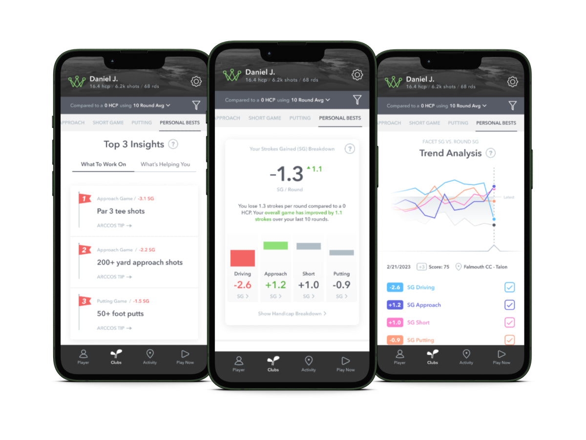 • Top 3 Insights show clear path to improve • Set target handicap for more achievable goal • See detail breakdown of each game facet • Trend analysis of your game and rounds • Get specific tips from world-class pros